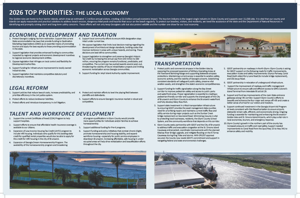 The Brunswick-Golden Isles Chamber of Commerce advocates on behalf of business in Brunswick and Glynn County, and on behalf of the business interests of its members.