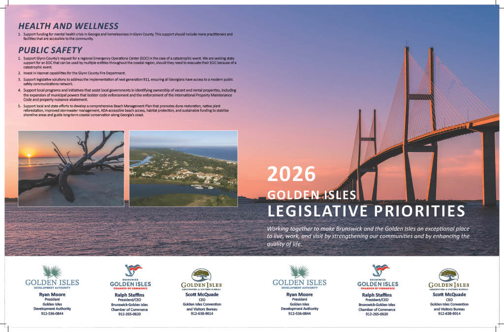 The Brunswick-Golden Isles Chamber of Commerce advocates on behalf of business in Brunswick and Glynn County, and on behalf of the business interests of its members.